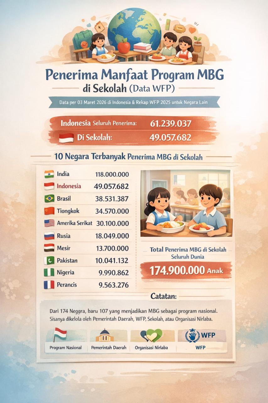 Per 3 Maret 2026, jumlah penerima manfaat Program MBG di Indonesia telah mencapai 61.239.037 orang, dengan 49.057.682 di antaranya merupakan siswa di sekolah. Capaian ini menunjukkan komitmen kuat pemerintah dalam memastikan anak-anak Indonesia mendapatkan asupan gizi yang cukup untuk mendukung pertumbuhan, kesehatan, dan kemampuan belajar mereka.