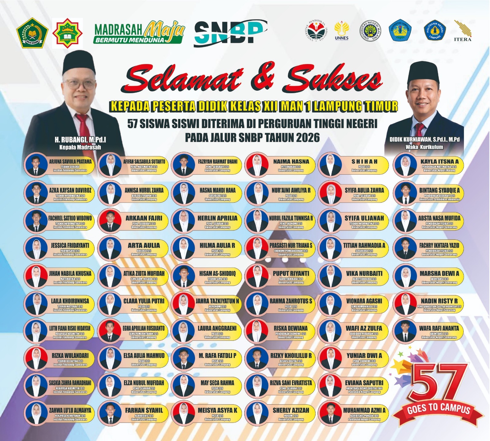 “Alhamdulillah, kami keluarga besar MAN 1 Lampung Timur mengucapkan selamat kepada 57 peserta didik yang telah dinyatakan lulus di perguruan tinggi. Ini merupakan capaian yang sangat membanggakan bagi kami,” ujar Rubangi, Rabu (1/4/2026).