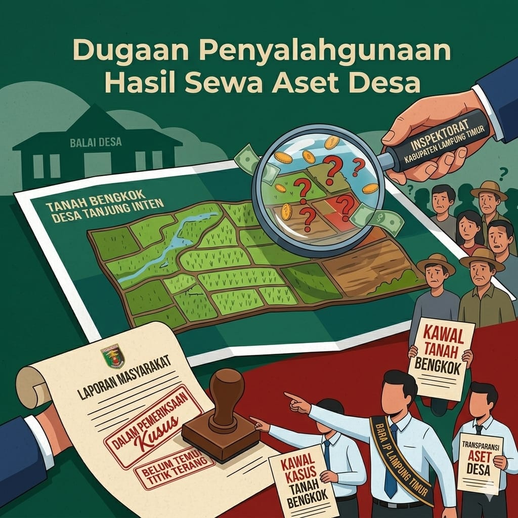Embaranpos id-Lampung Timur – Dugaan penyalahgunaan hasil sewa aset desa berupa tanah bengkok di Desa Tanjung Inten, Kecamatan Purbolinggo, Kabupaten Lampung Timur hingga kini masih belum menemukan titik terang. Meski laporan masyarakat sudah bergulir cukup lama, proses penanganannya masih berada di meja pemeriksaan Inspektorat Kabupaten Lampung Timur.