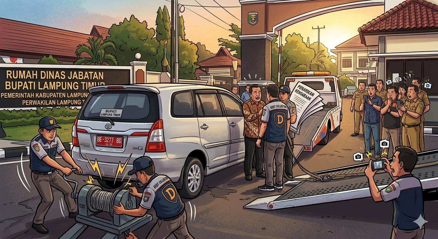 Embaranpos.id-Lampung Timur – Peristiwa mengejutkan terjadi di lingkungan Pemerintah Kabupaten Lampung Timur. Sebuah mobil dinas jenis Toyota Innova yang sehari-hari digunakan oleh Bupati Lampung Timur, Ela Siti Nuryamah, dikabarkan ditarik oleh debt collector.